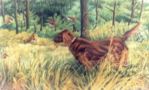 The tale actually began long ago and far away in the land of Ireland, the Emerald Isle, land of legends and the country of origin for the Irish Red Setter breed. Americans can relate to those freedom loving Irishmen who prize their hunting dogs. There is a sameness with which to identify. The Irish developed an awesome setter dog of red and white or chestnut and white color specifically to hunt the rugged terrain of the Irish moors. Speculation suggests a blend of English Setter, Pointer, Gordon Setter, both land and water spaniel as probable contributors to the Irish Red Setter which became well established as a recognizable breed by the year 1800. Sportsmen of old reveal clues that the finest hunting dog that ever lived was the great Gaelic Modder Rhu. Herewith, the red dog’s reputation spread far and wide and its seed salted the earth. In time public demand for solid red prevailed over red and white, but many modern breed representatives carry traces of white on chest, fore skull, muzzle or feet which is duly accorded by the native Irish Standard. Some hint that solid red marks a lesser dog in the field.