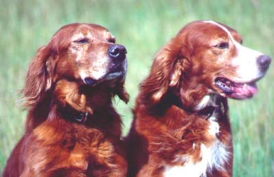 Today’s Red Setter is medium sized, lean and well muscled, red or chestnut, often with traces of white on head, forechest and feet. Excepting it’s traditional American high tailed lofty stance, and application developed for American conditions, terrain and game, it is very similar to its working Irish forebears. Indeed the National Red Setter Field Trial Club continues to identify Red Setters with Ireland, the country of origin.